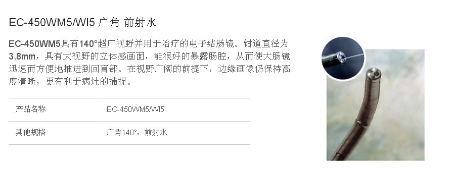 EC-450WM5具有140°超廣視野并用于治療的電子結(jié)腸鏡。鉗道直徑為3.8mm,具有大視野的立體感畫(huà)面,能很好的暴露腸腔,從而使大腸鏡迅速而方便地推進(jìn)到回盲部。在視野廣闊的前提下,邊緣畫(huà)像仍保持高度清晰,更有利于病灶的捕捉。